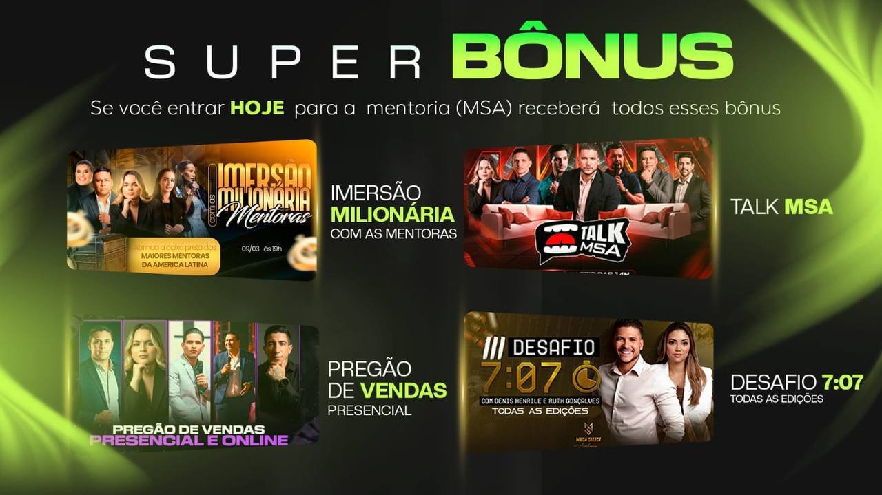 A Mentoria MSA, também conhecida como Musa Select Academy, oferece aulas gravadas e mentorias ao vivo. Ensina tráfego pago, copywriting e WhatsApp “X1”.